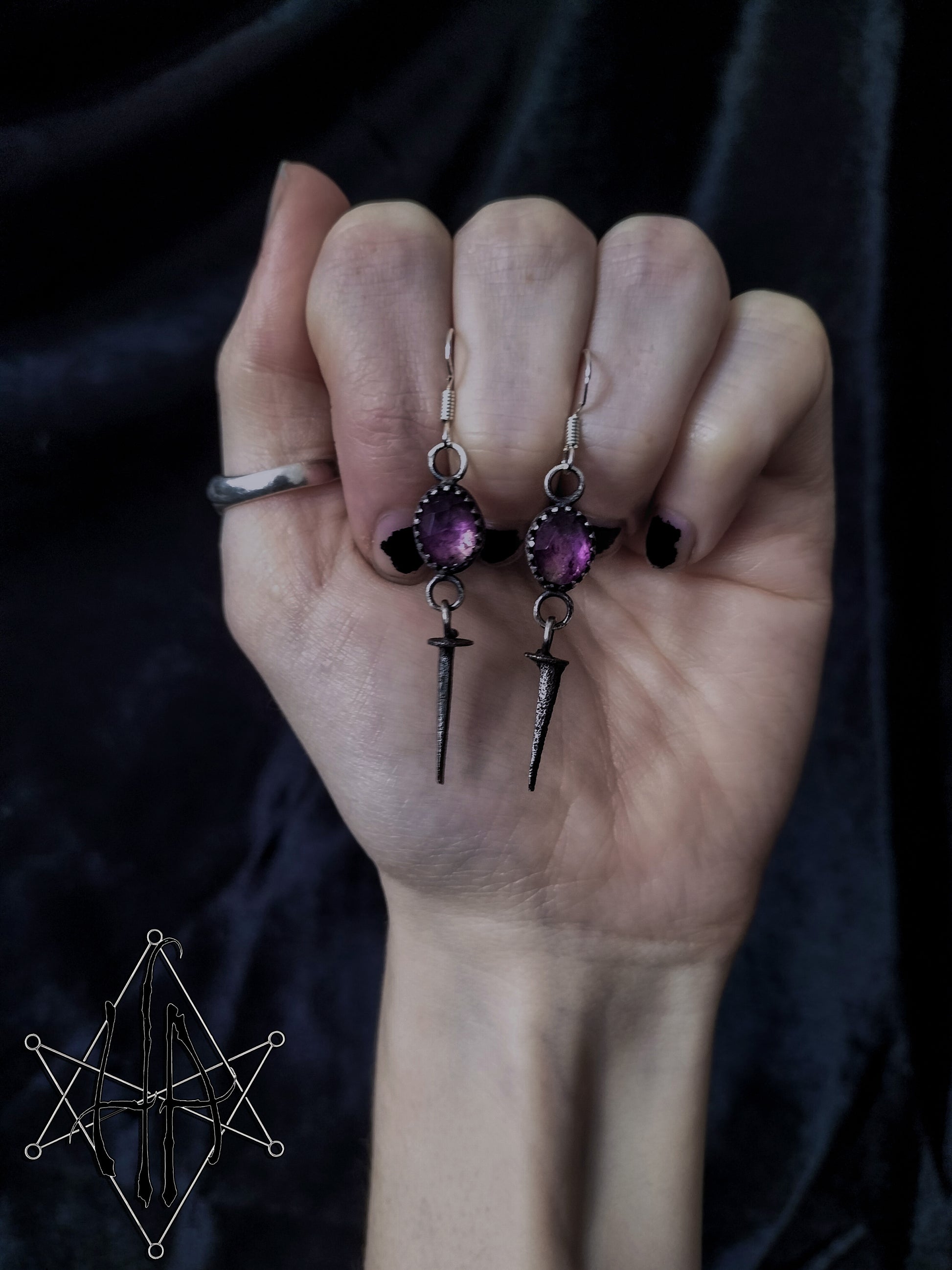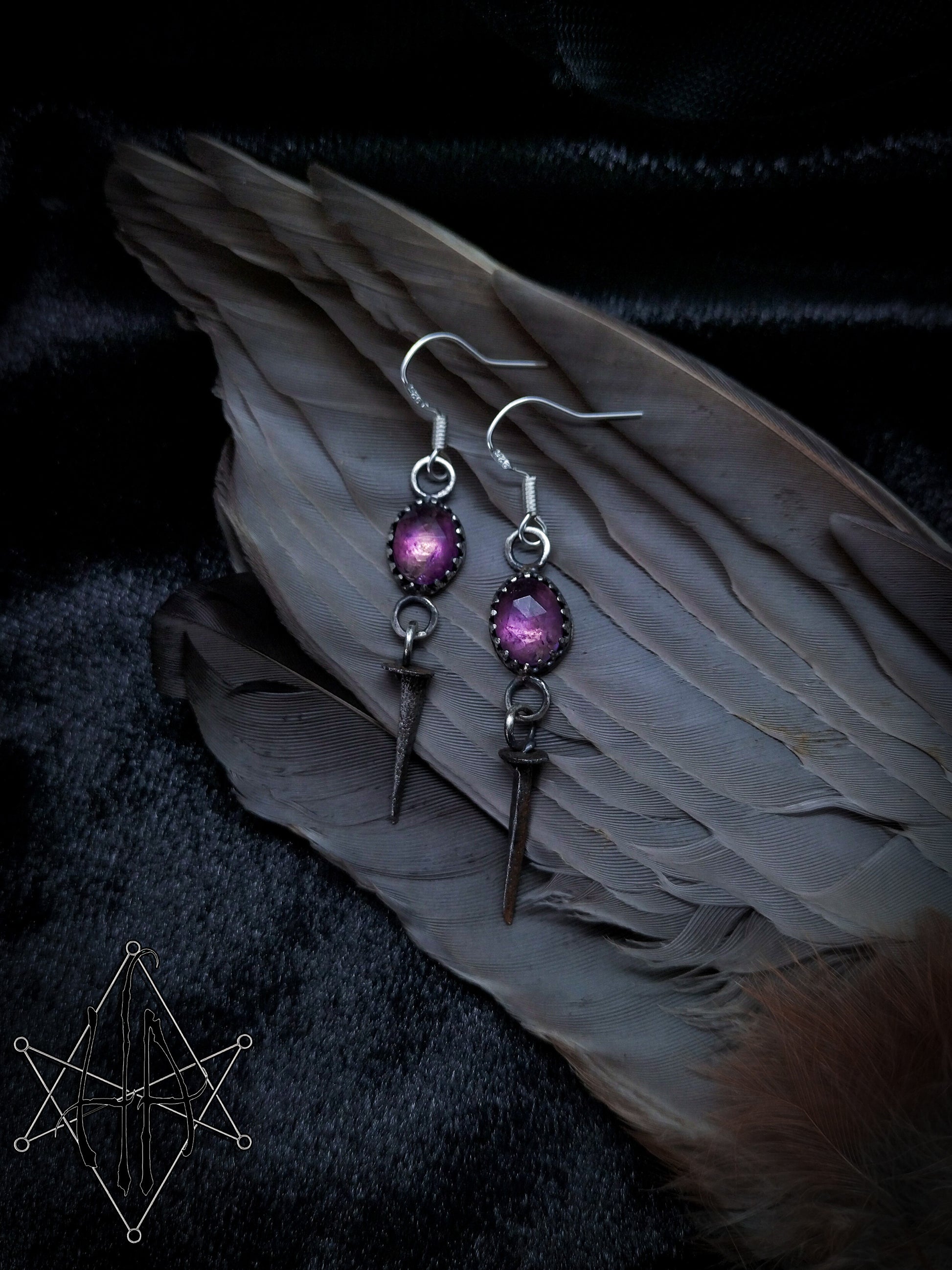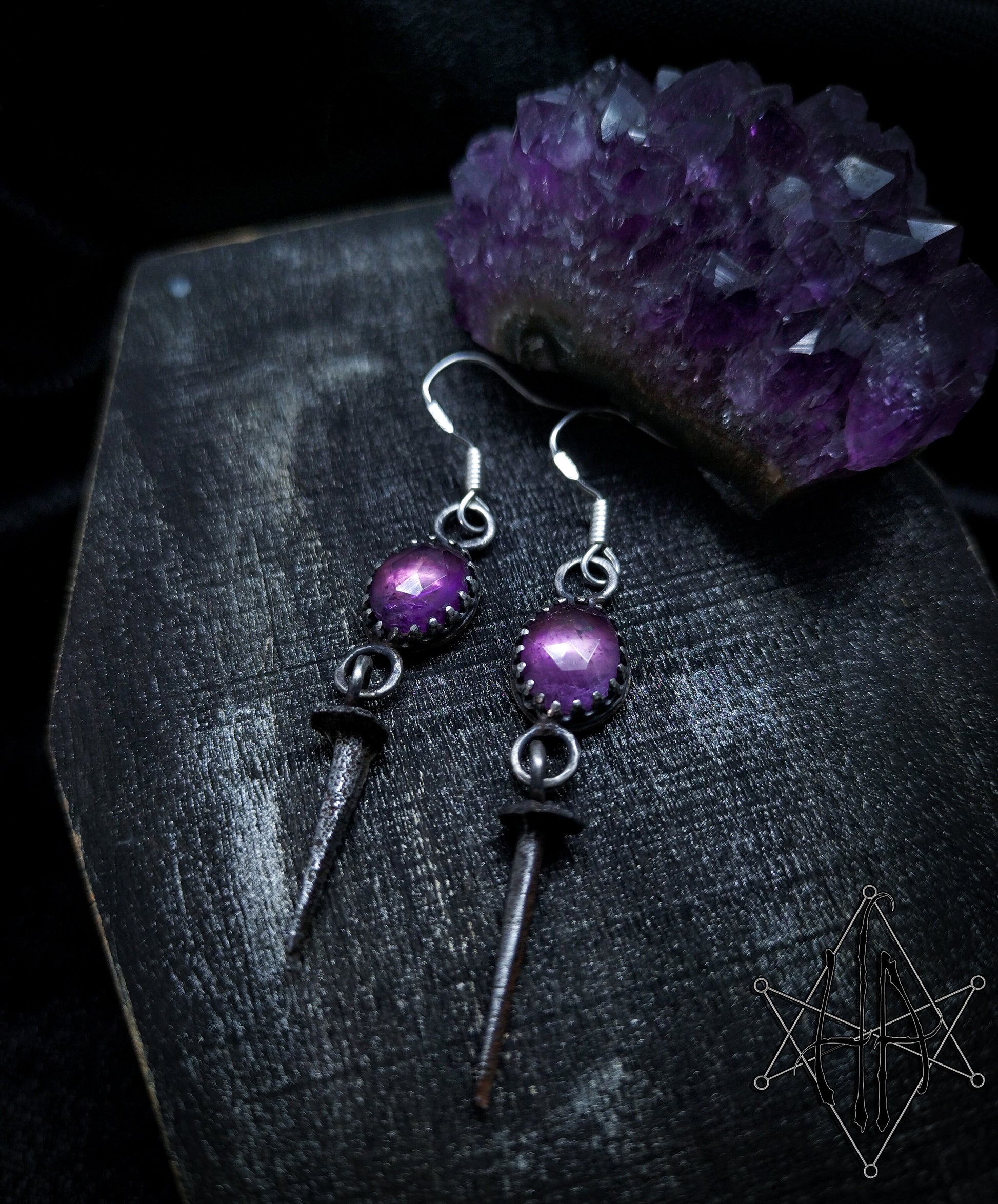 The perfect balance of light and dark, these delicate Amethyst and Vintage Coffin Nail Earrings exude vintage glamour with a modern edge that speaks to your inner dark goddess. Both glowy and tasteful, these earrings will be the perfect statement piece for an elegant and refined look. These earrings come on sterling silver ear wires for lobe piercings.