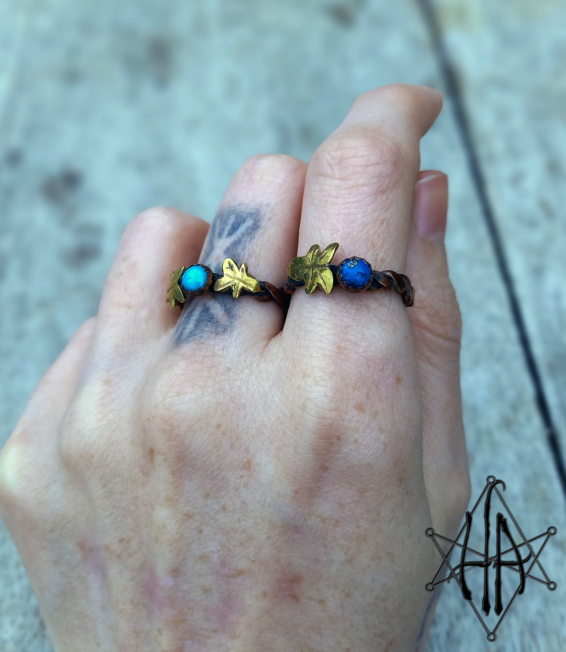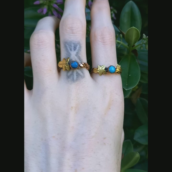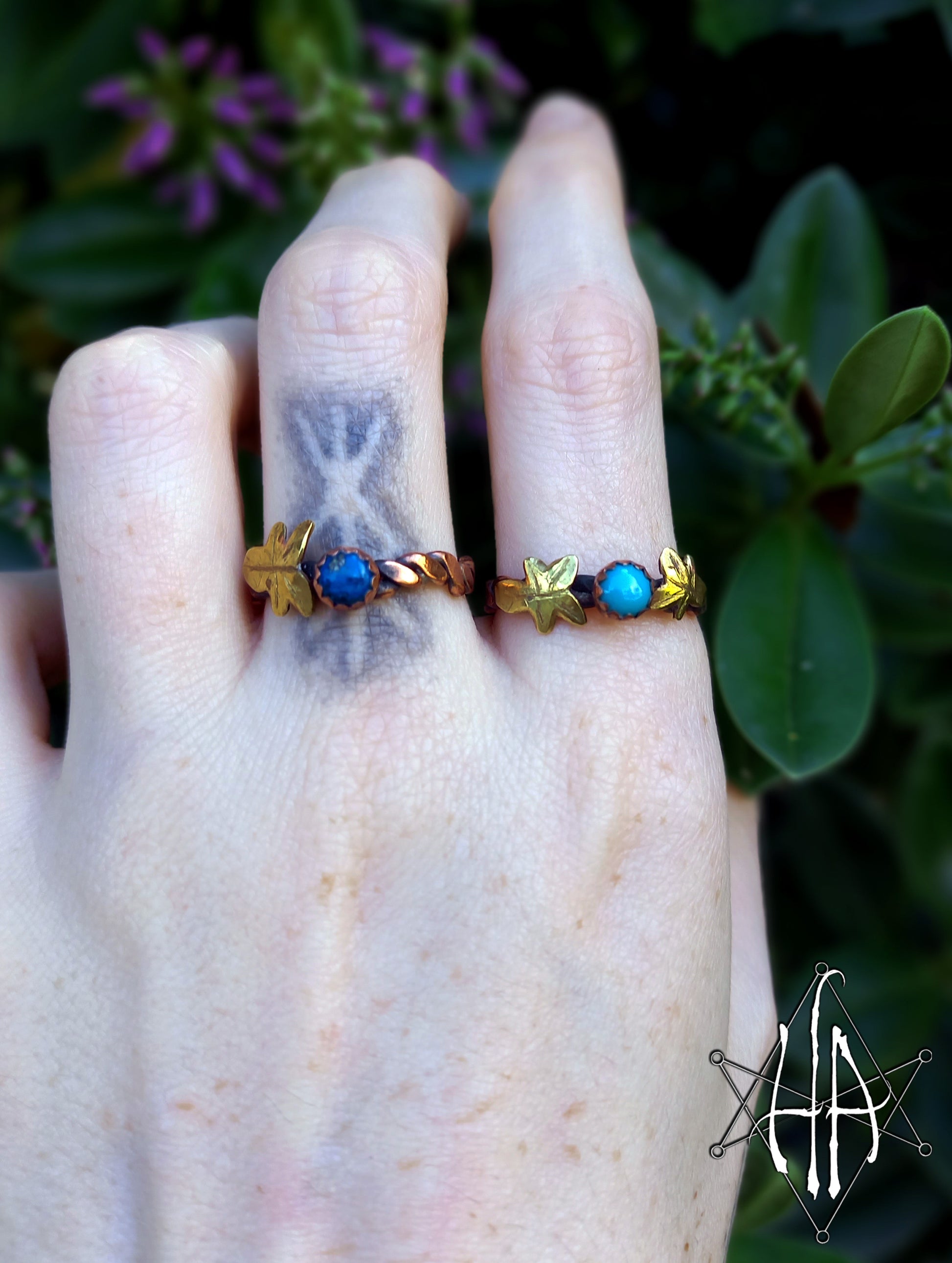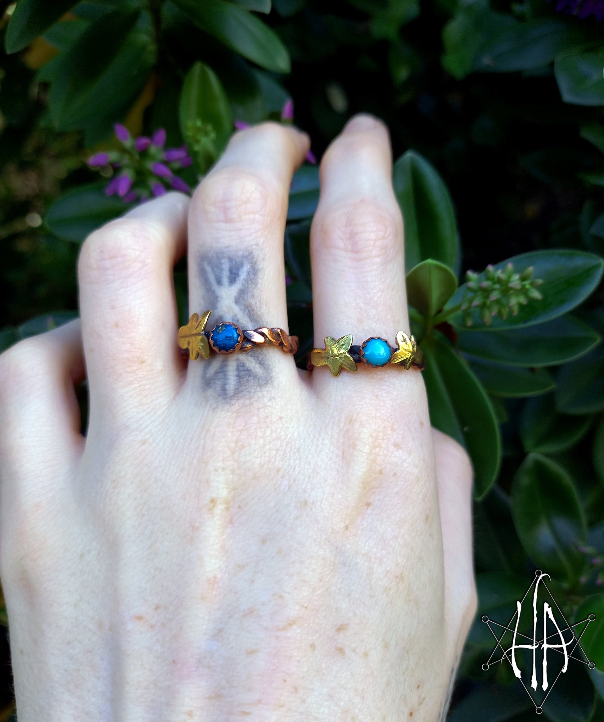 Beautiful copper Celtic Knot inspired rings with leaf detailing and 5mm turquoise cabochons. Inspired by the Sacred trees revered by the Celts and Druids of England.