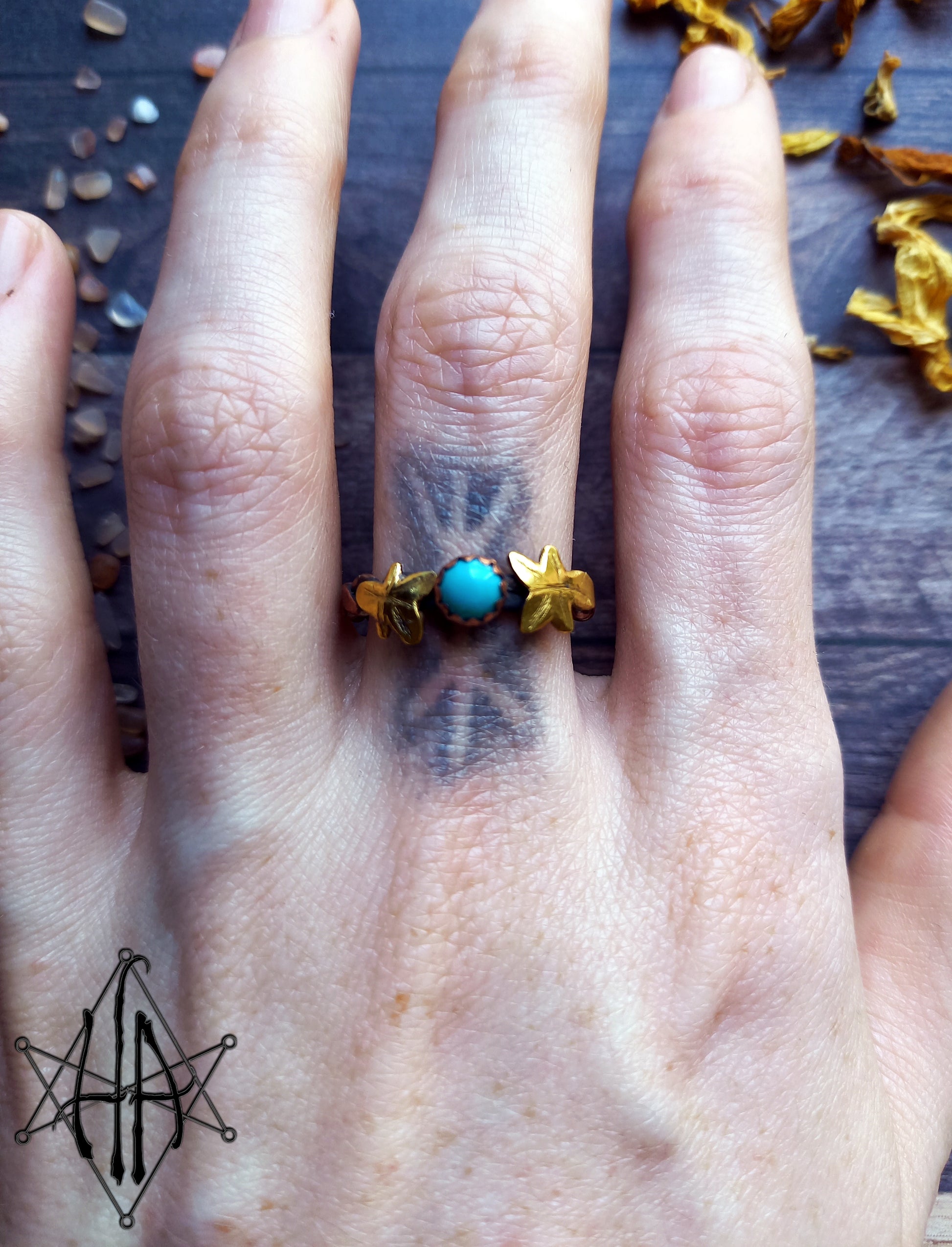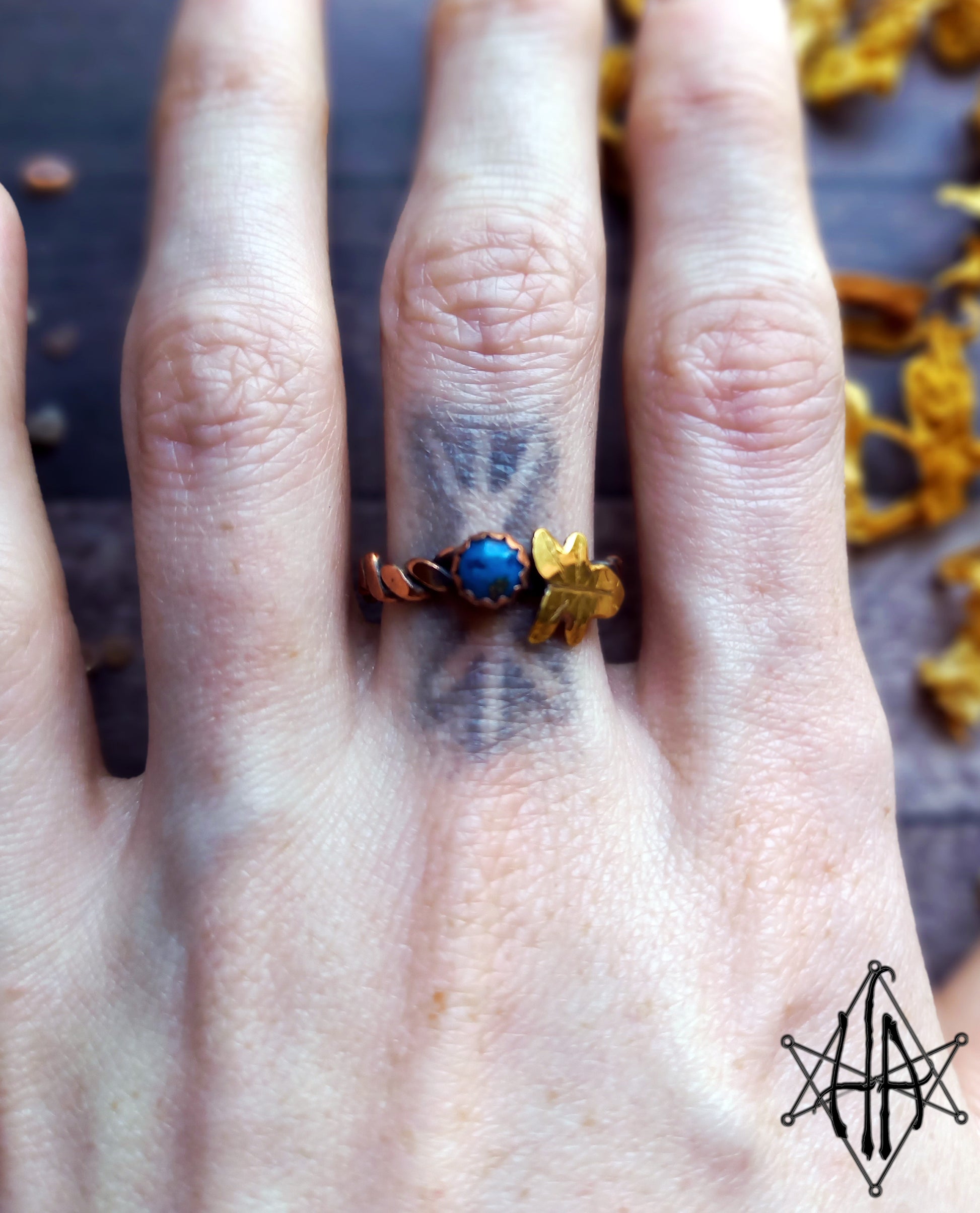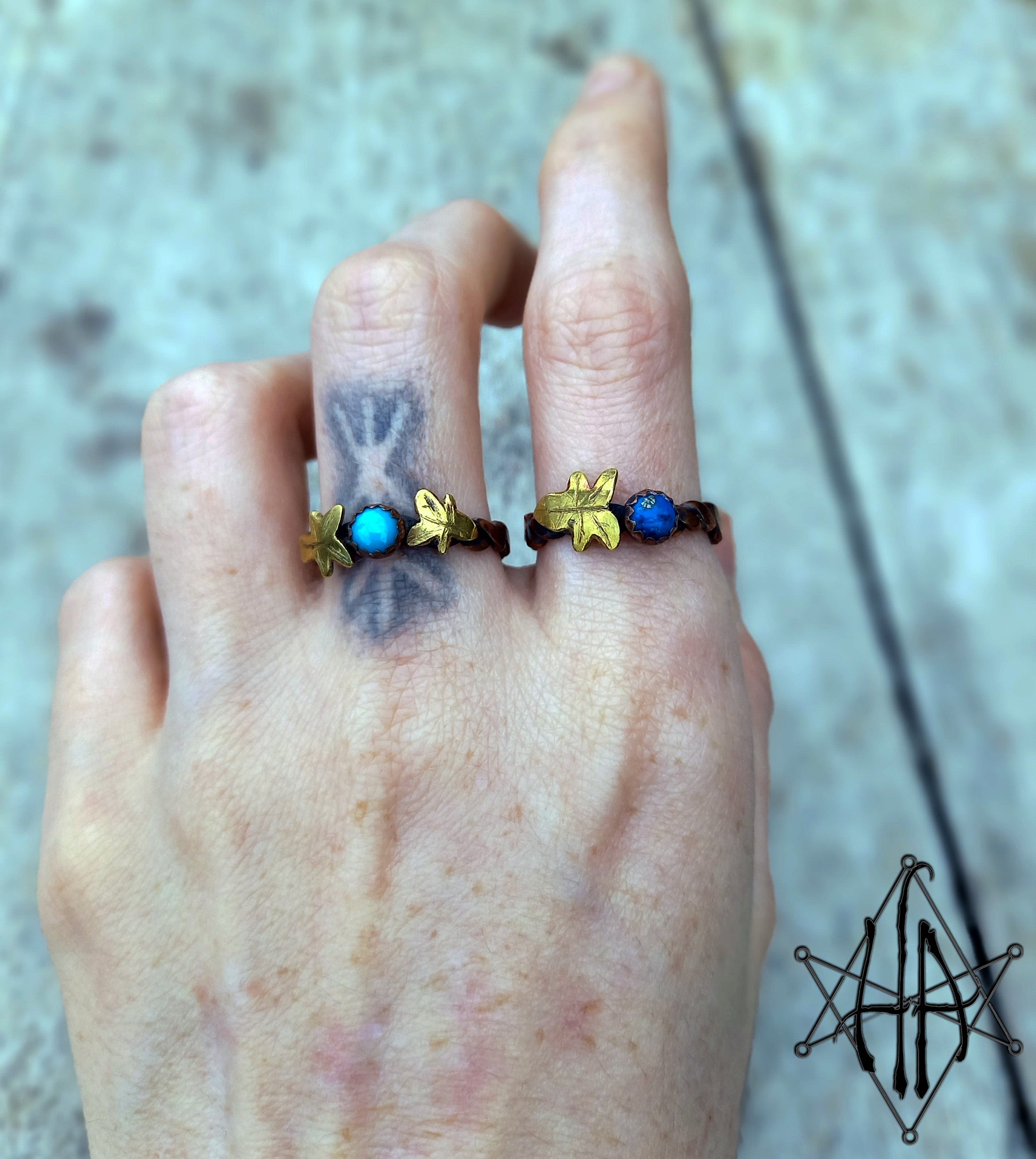 Beautiful copper Celtic Knot inspired rings with leaf detailing and 5mm turquoise cabochons. Inspired by the Sacred trees revered by the Celts and Druids of England.
