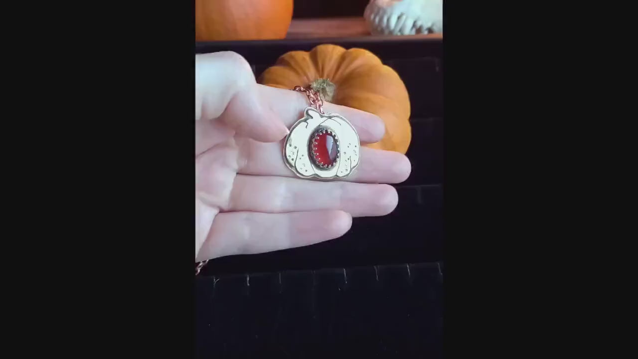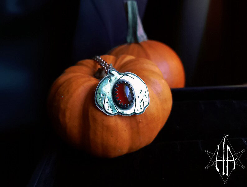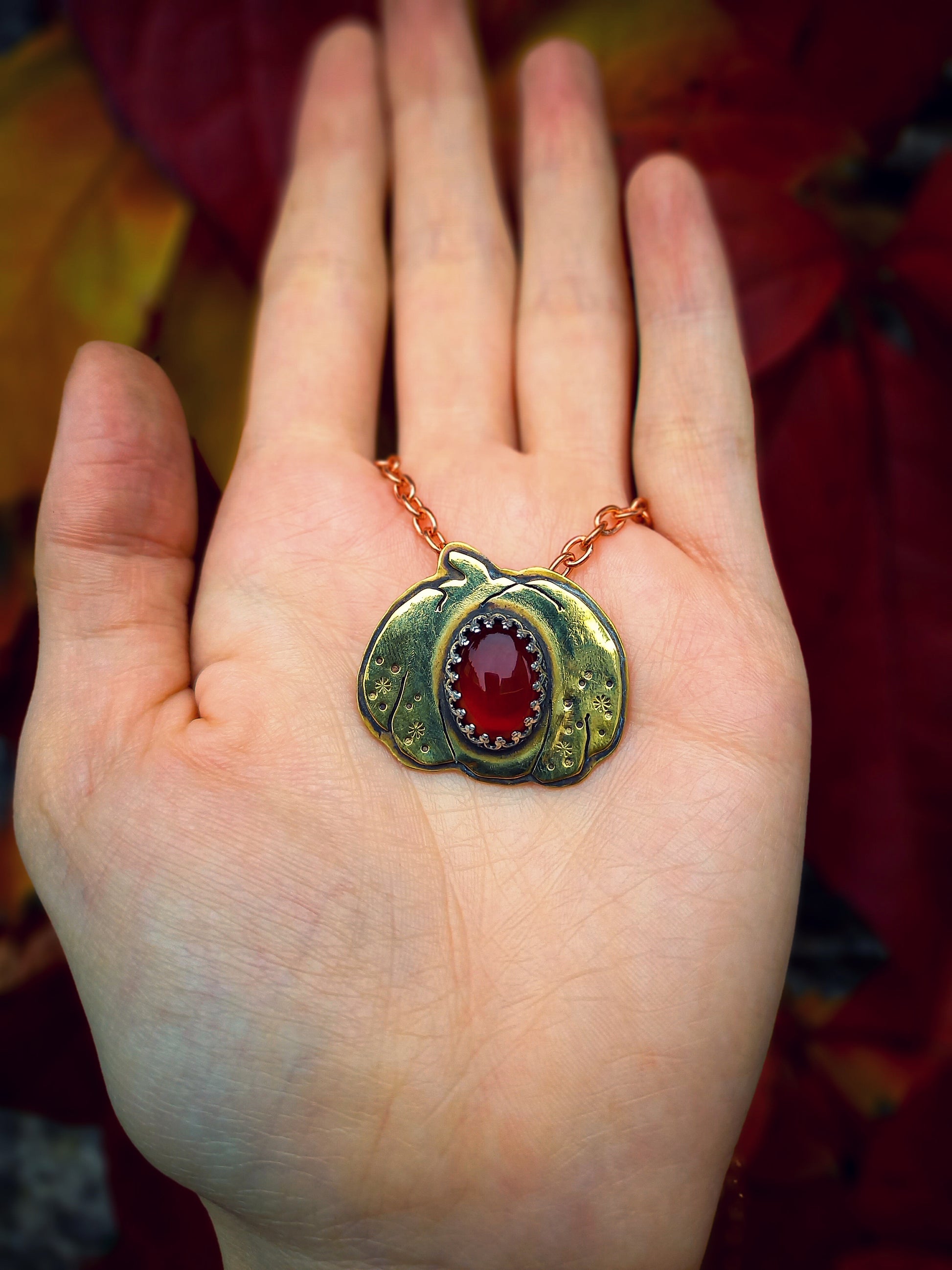A super adorable pumpkin shaped pendant, made from high quality brass. This little cutie also features a gorgeous carnelian cabochon in it's center.