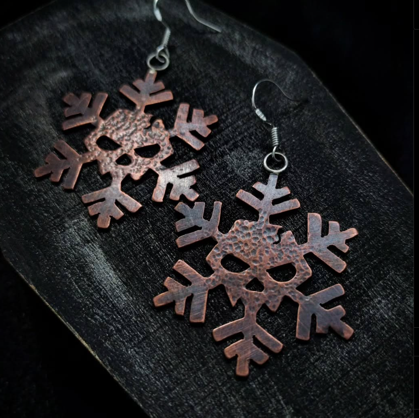 Add a spooky twist to your festive look with these Skullflake Earrings. Handmade from warm copper and brass, they blend gothic charm with holiday cheer. Perfect for those who love a playful, unconventional Christmas style that stands out from the crowd. Lightweight and unique, these earrings bring a touch of dark whimsy to your celebrations.