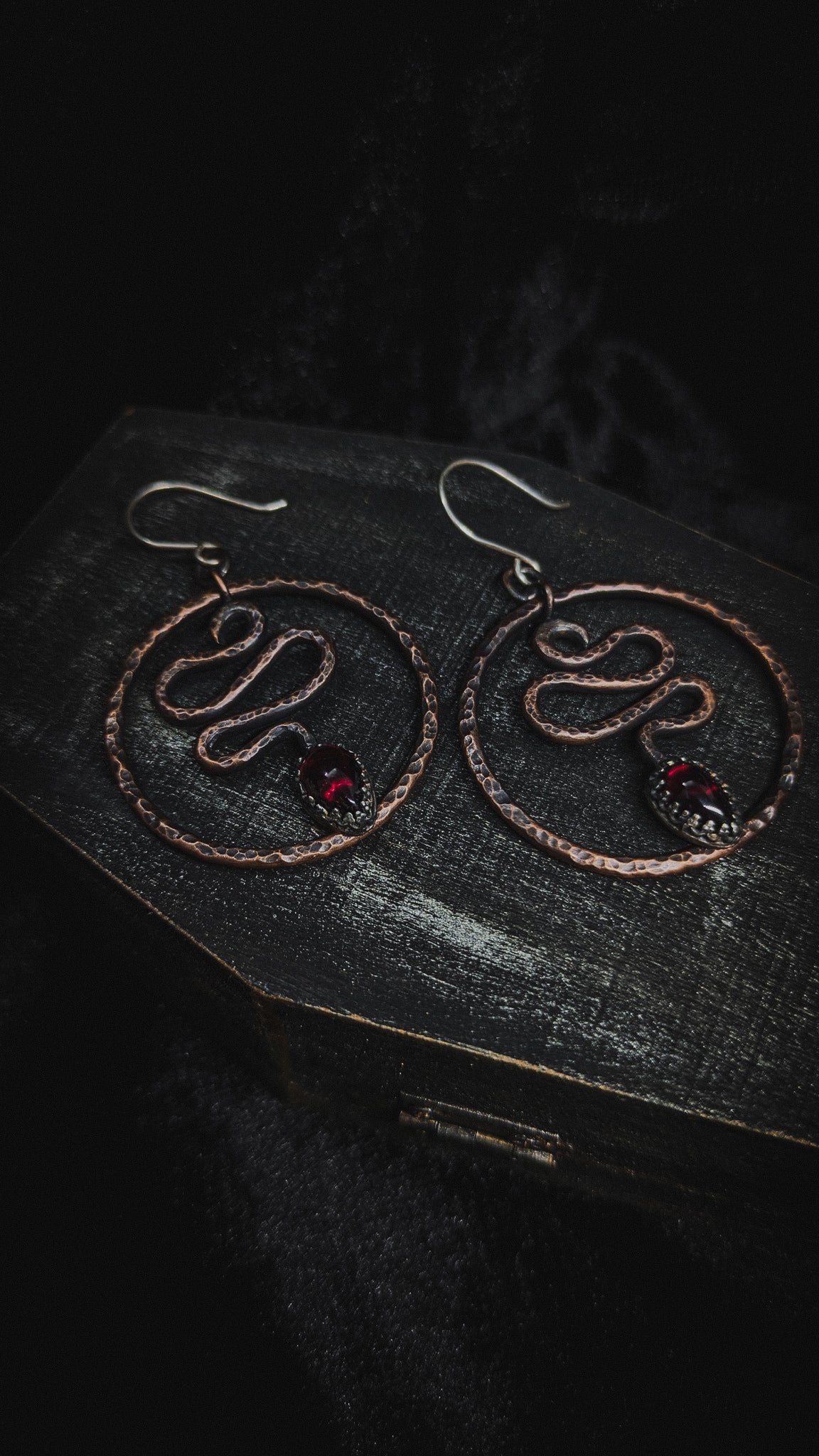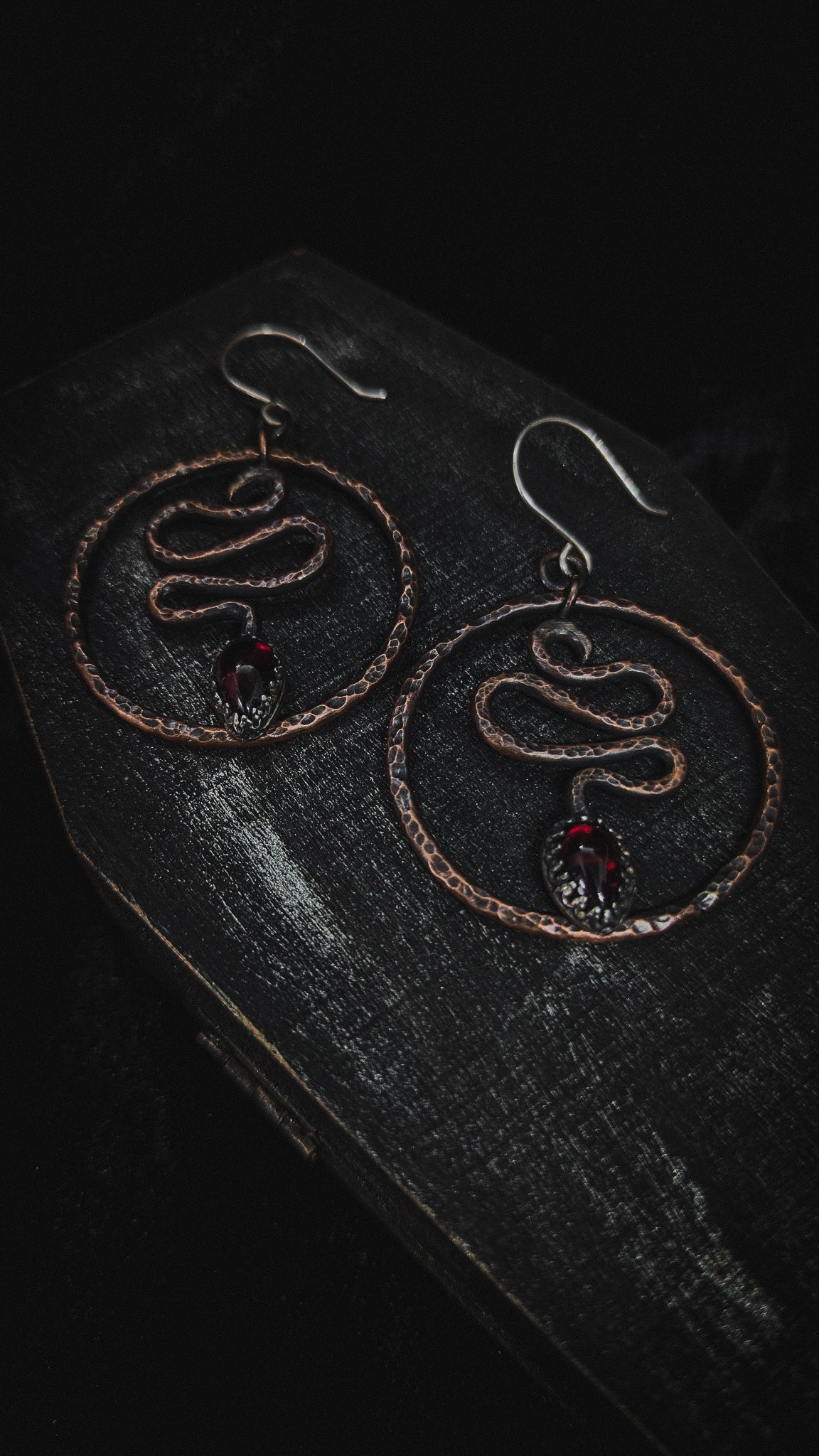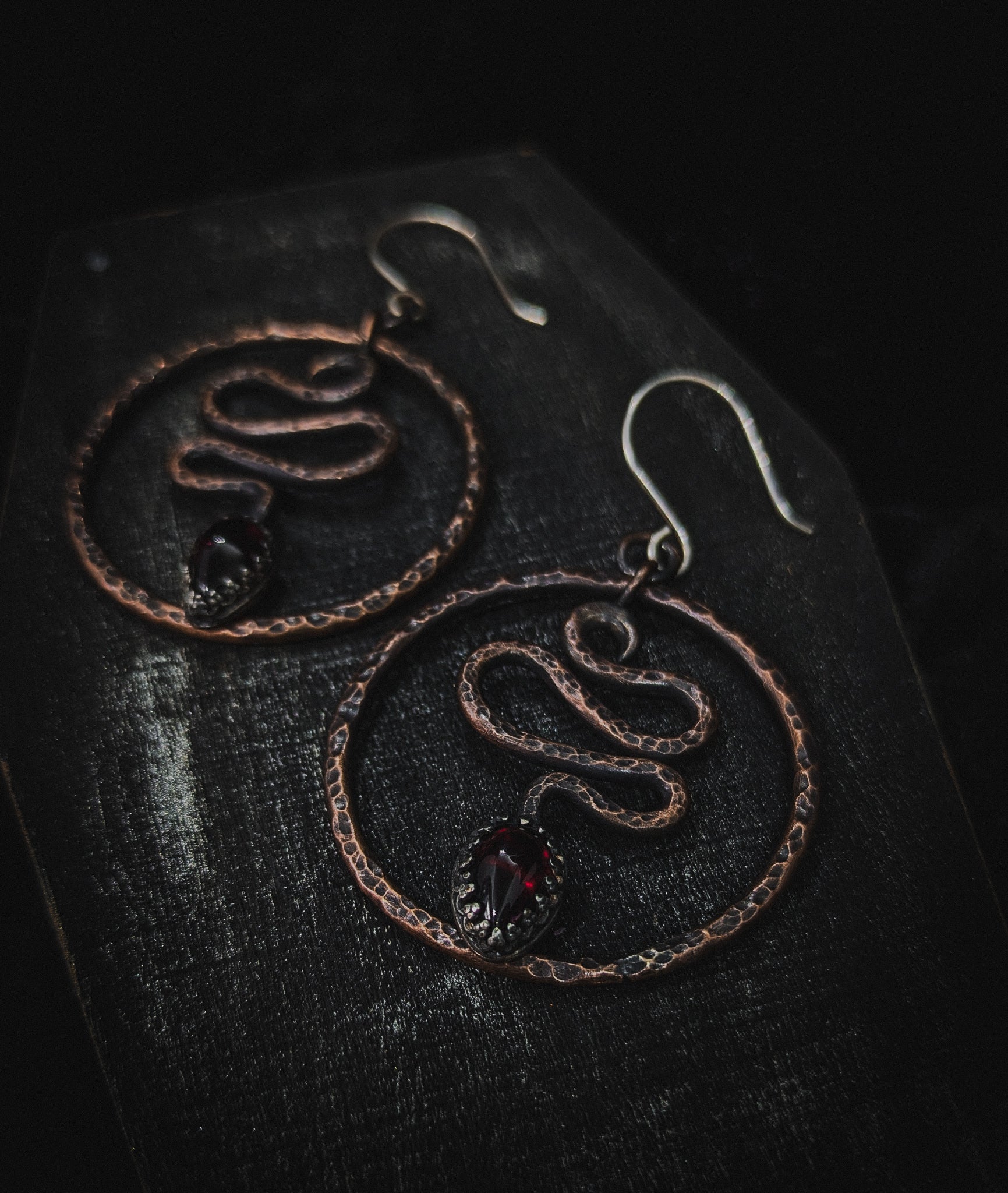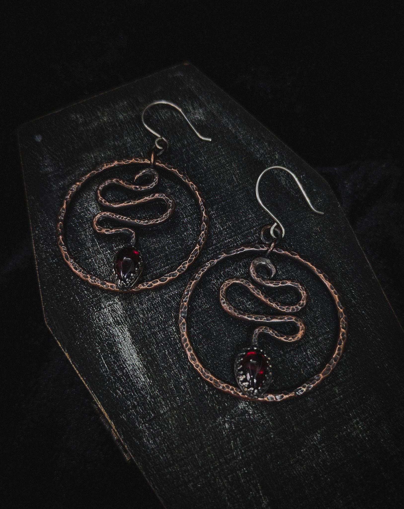 Snake Hoop Occult Earrings with Garnet