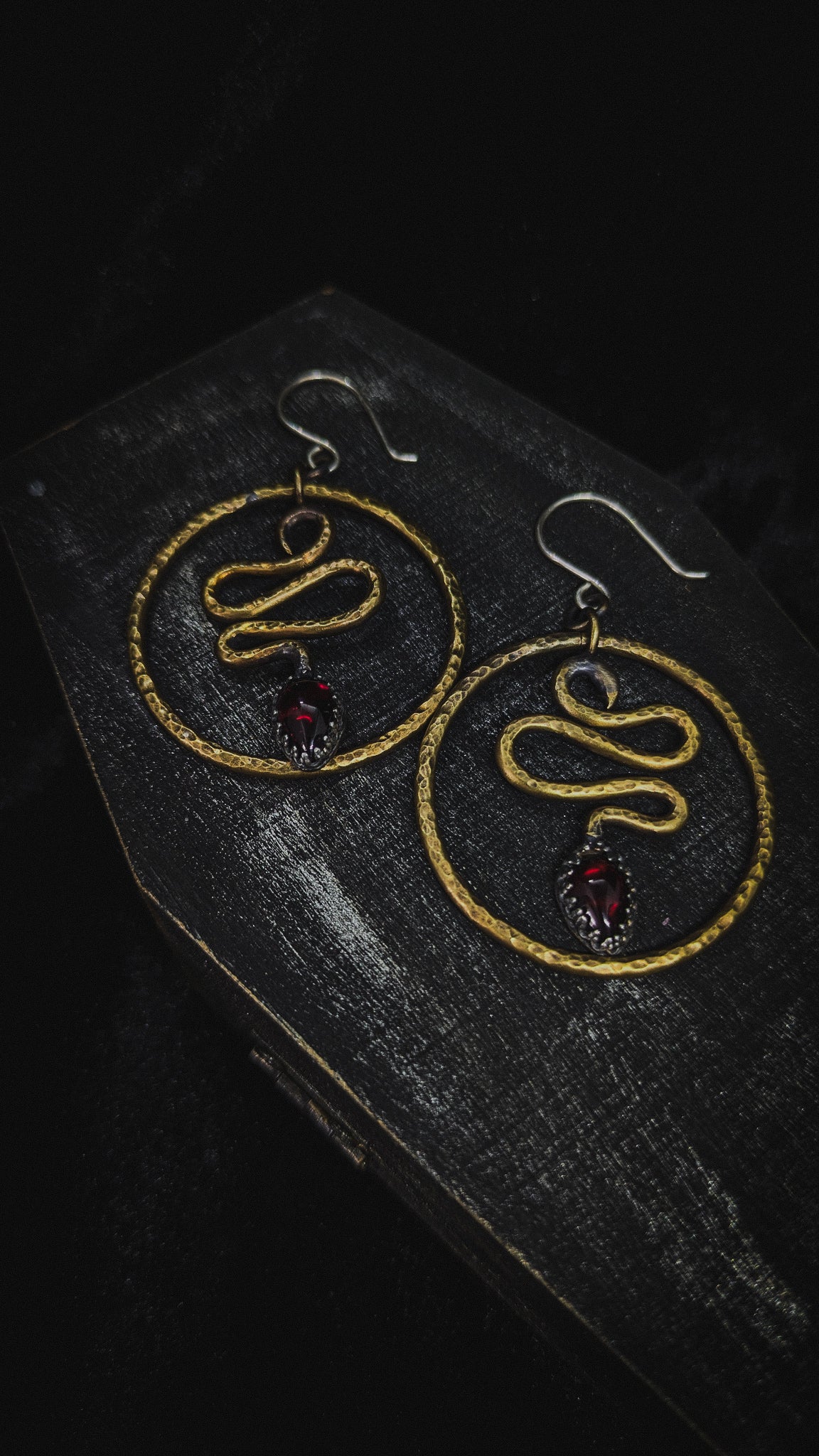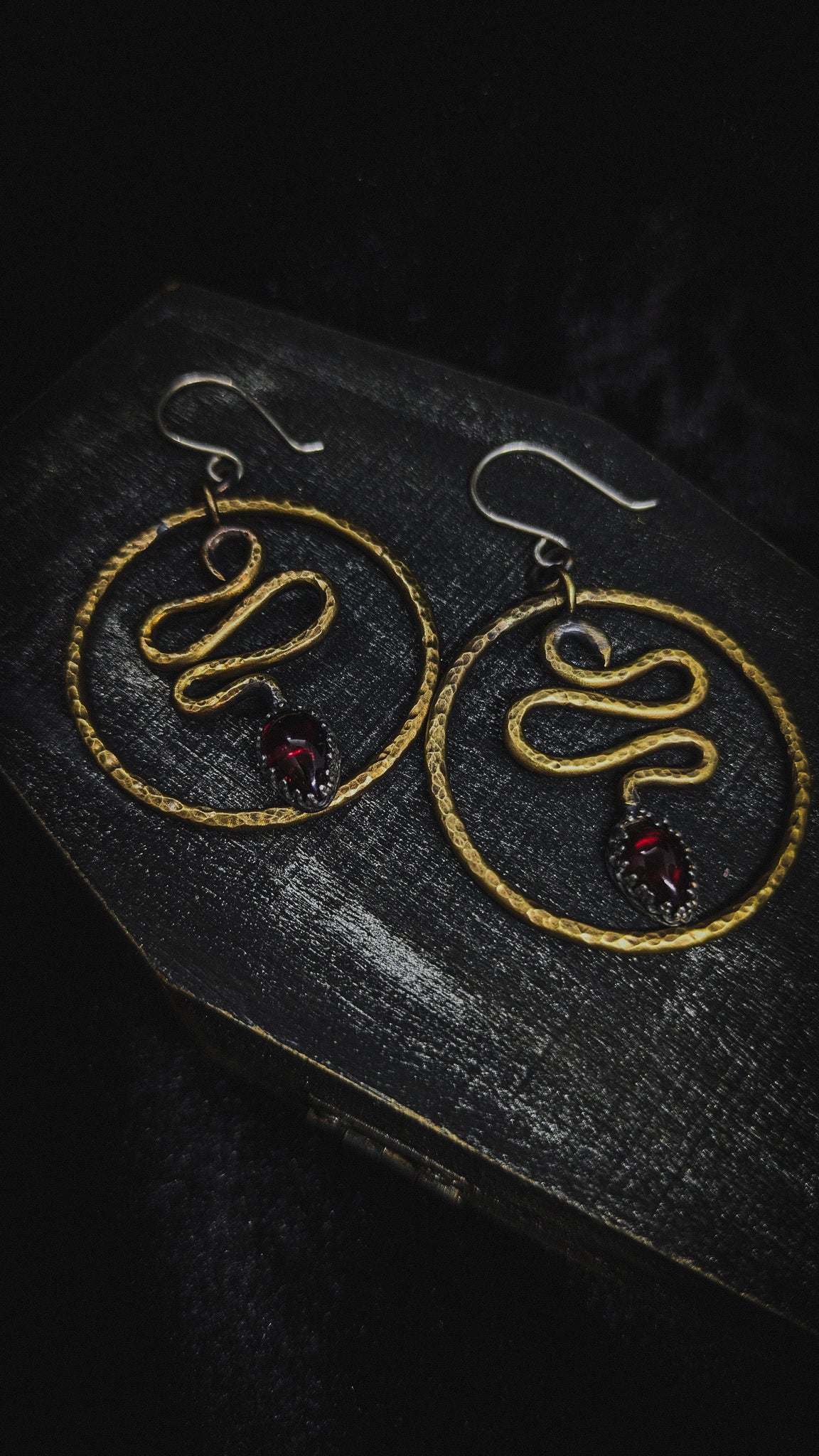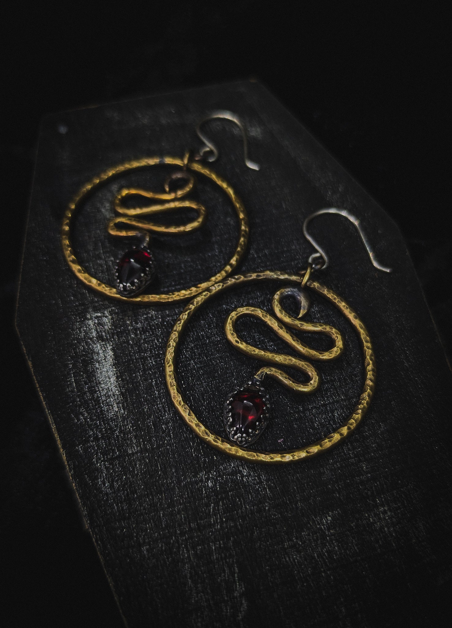 Embrace bold mystique with these Snake Hoop Earrings crafted from warm brass and adorned with deep red garnets. Inspired by occult symbolism, their sinuous design wraps your style in daring elegance, perfect for those who dare to stand out and channel powerful energy.