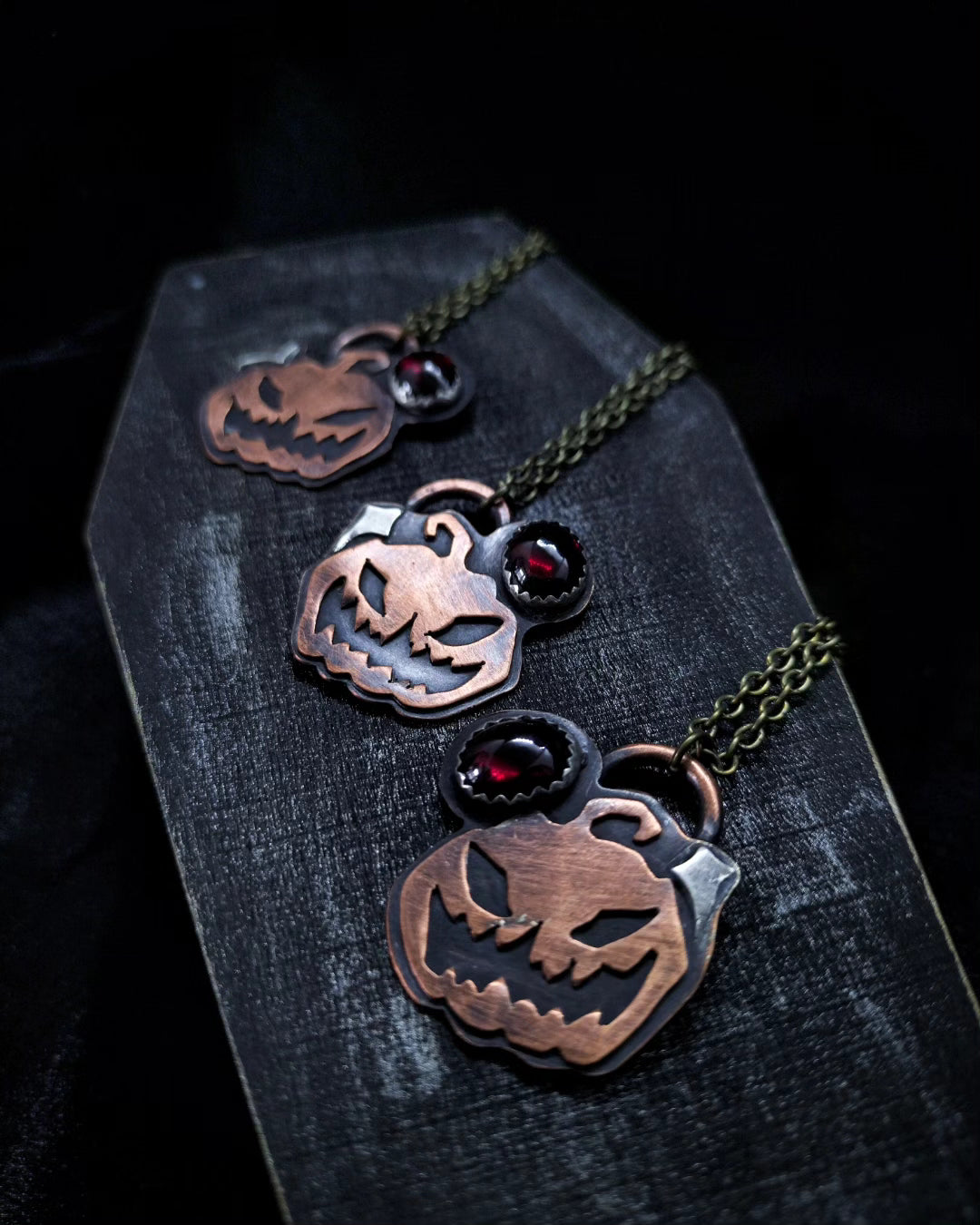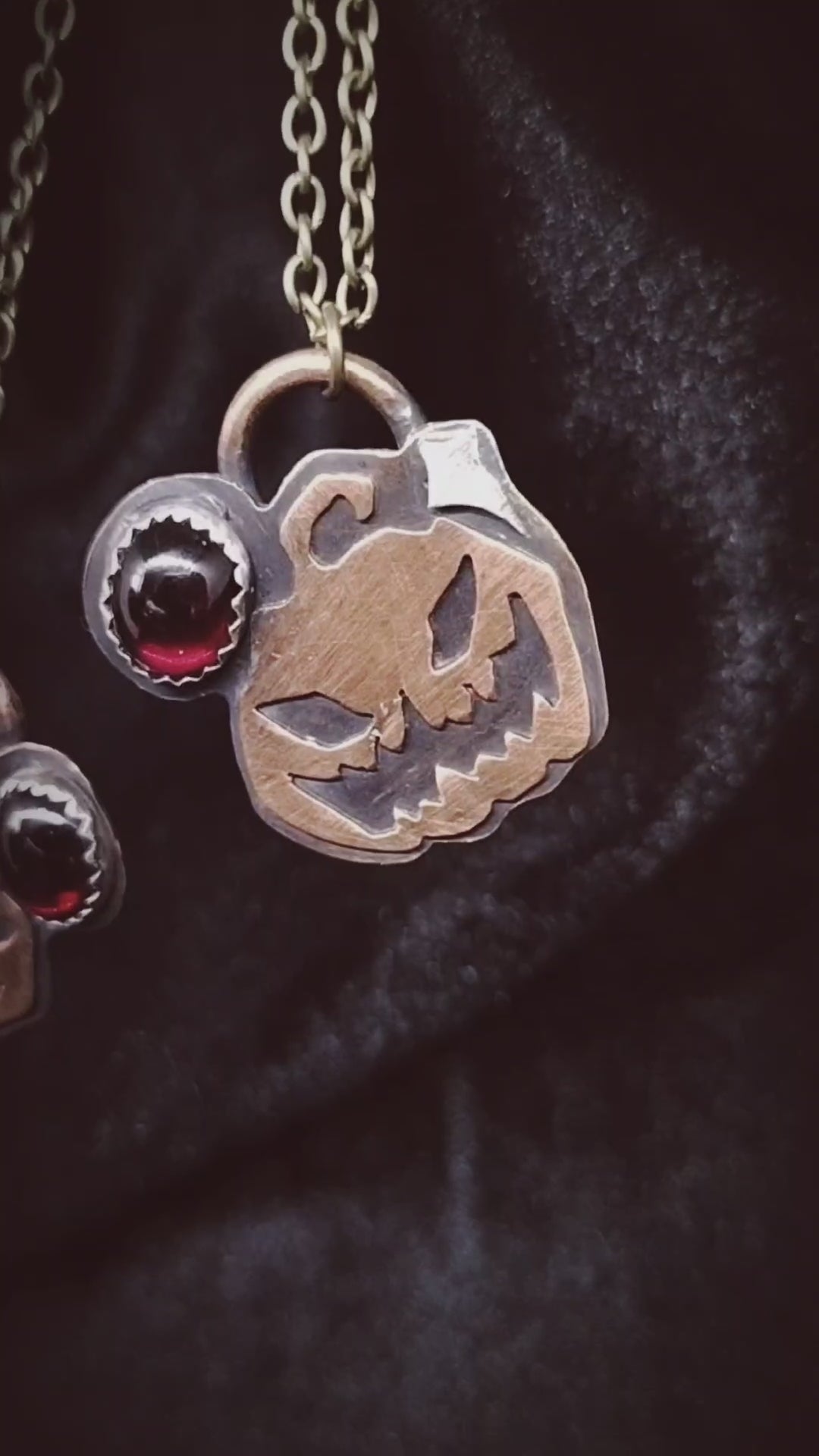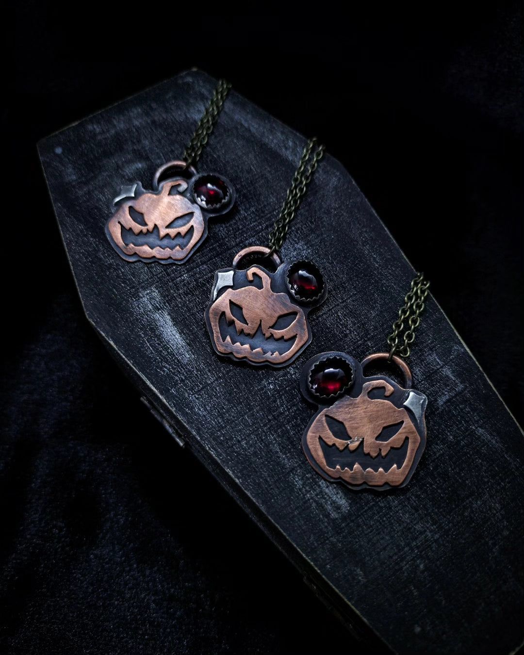Show your spooky side with this Halloween-themed necklace. The perfect accessory to make you stand out this fall, this Pumpkin and Garnet necklace will put a fright in all your friends! Crafted with an eerie spooky charm, you can get into the spirit of the season with this one-of-a-kind accessory!