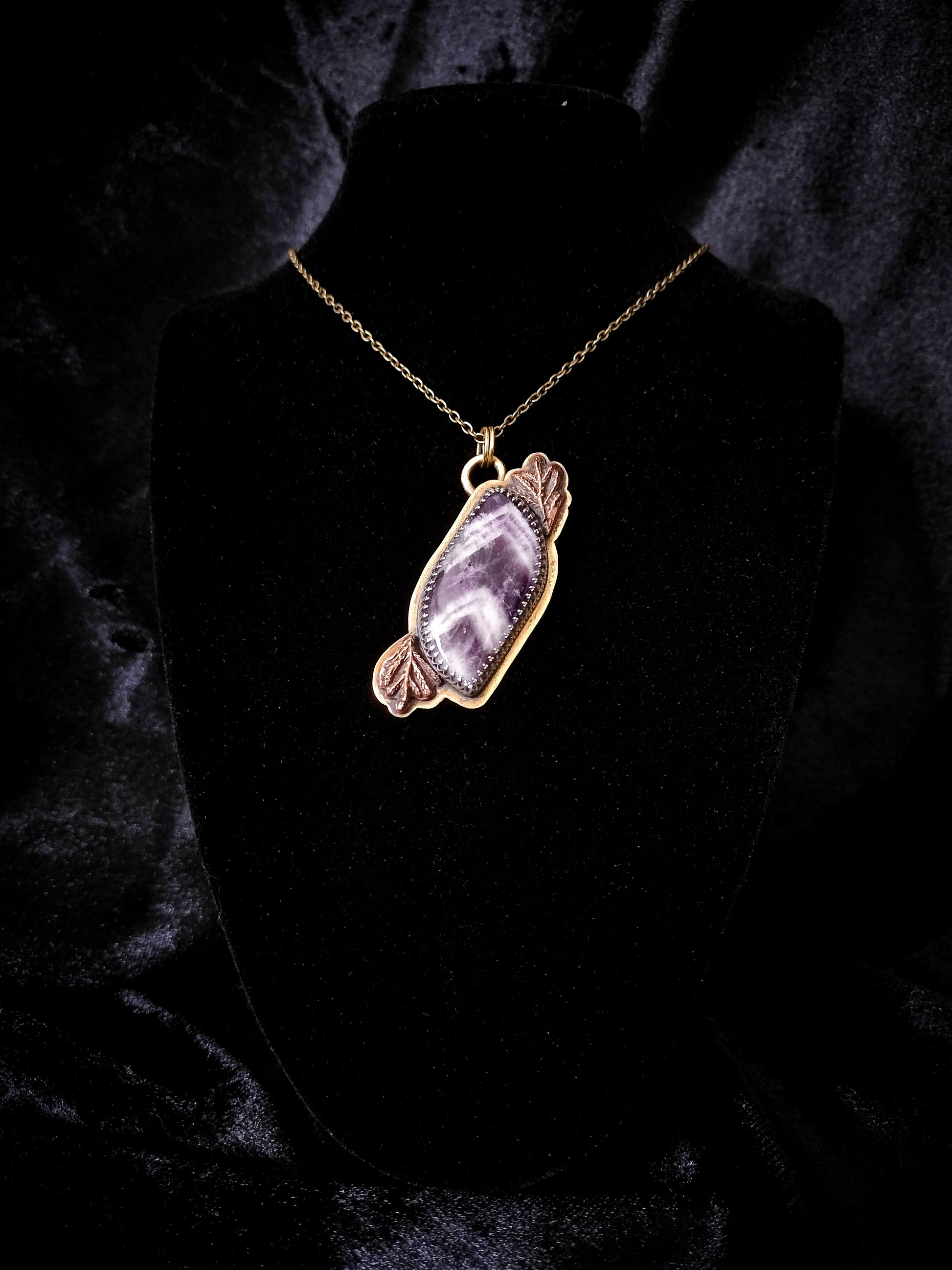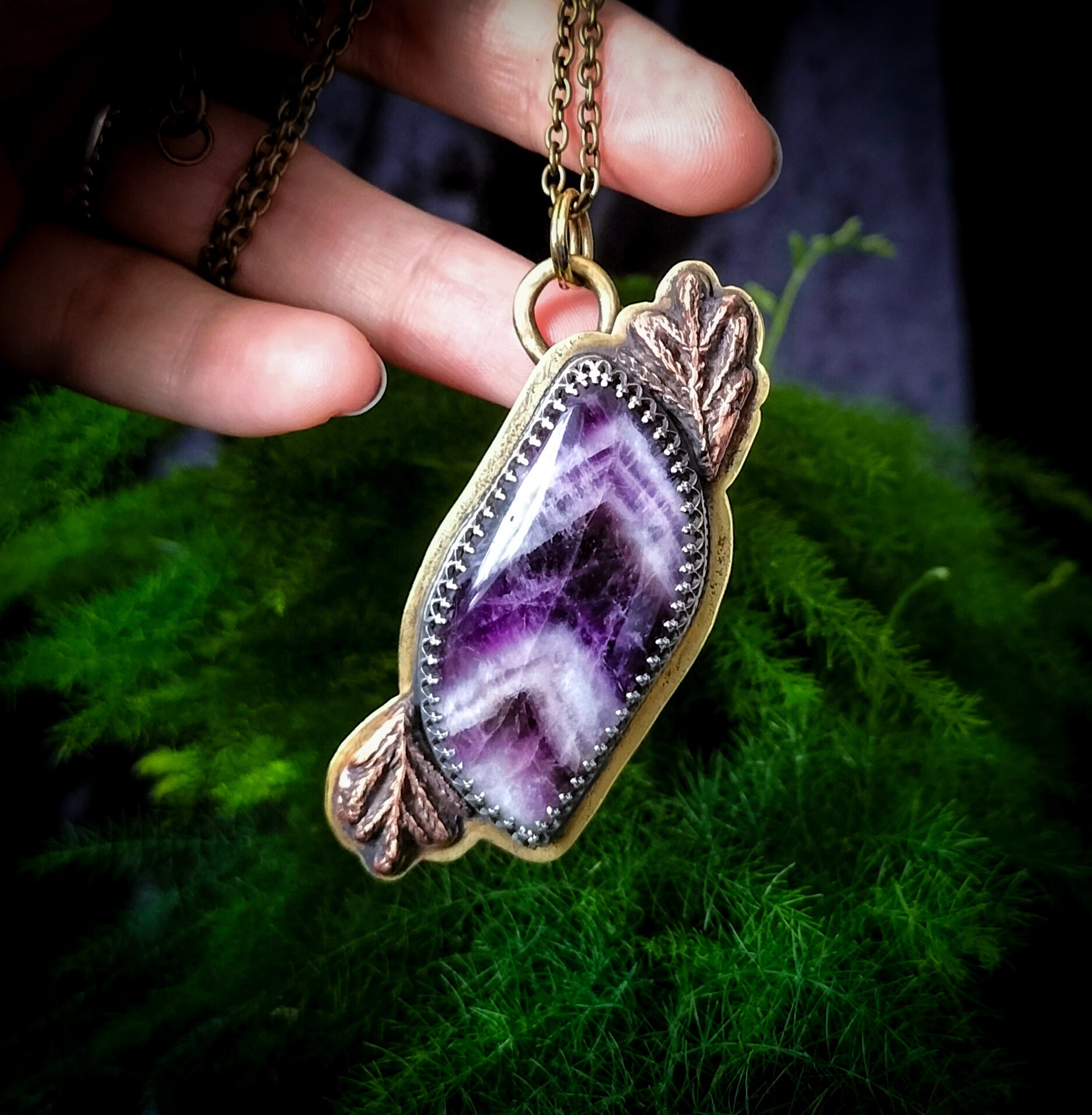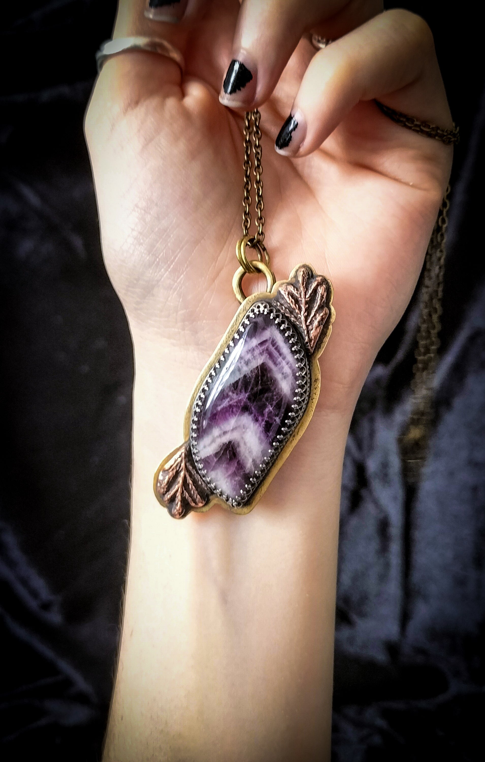 This statement piece features a deep, mysterious amethyst, a perfect jewel for any enchanting, nature-inspired look. Embellished with copper elven-inspired designs, this amethyst pendant is a perfect fit for the current cottagecore trend and will add an air of sophistication to any wardrobe.