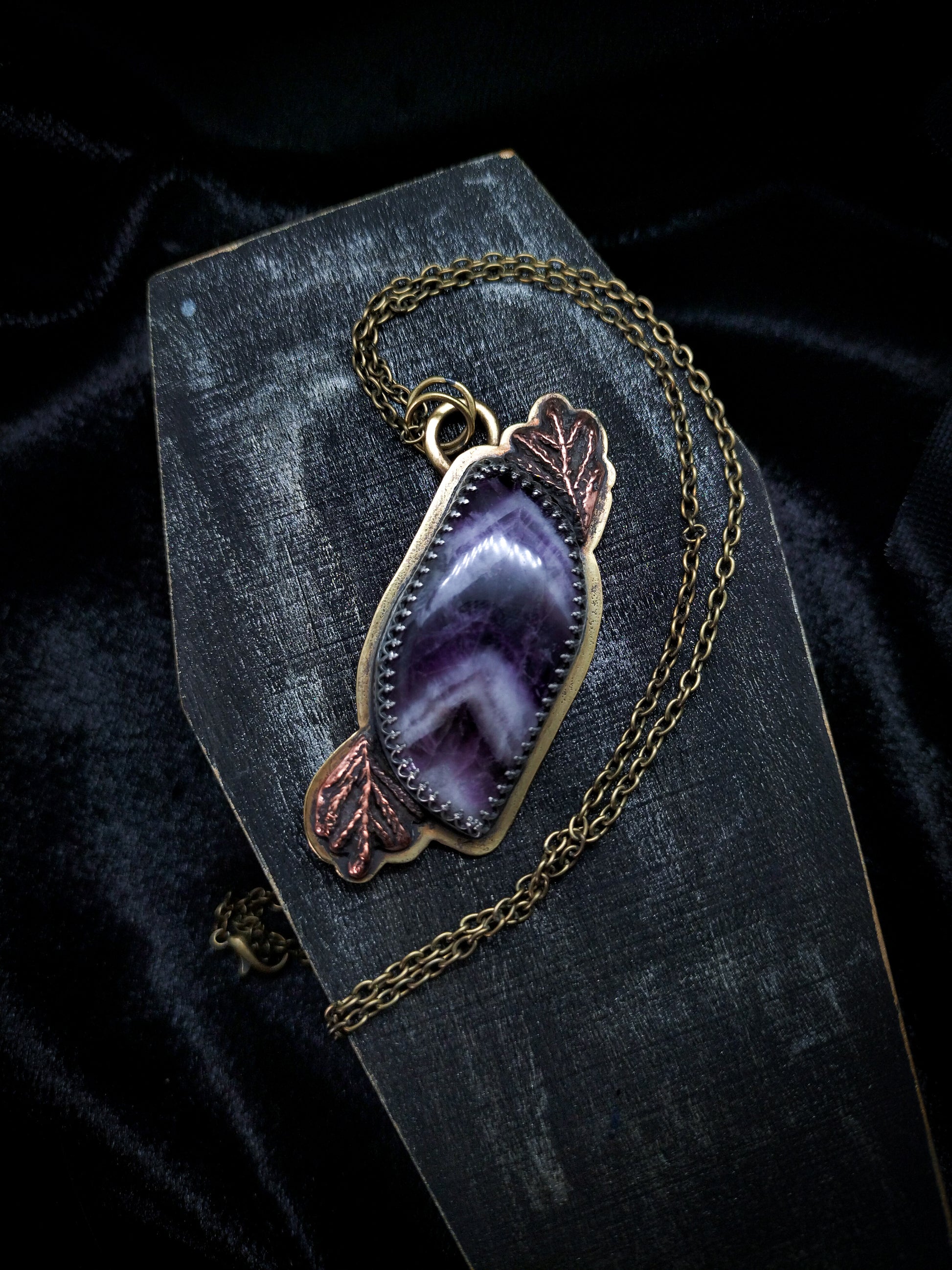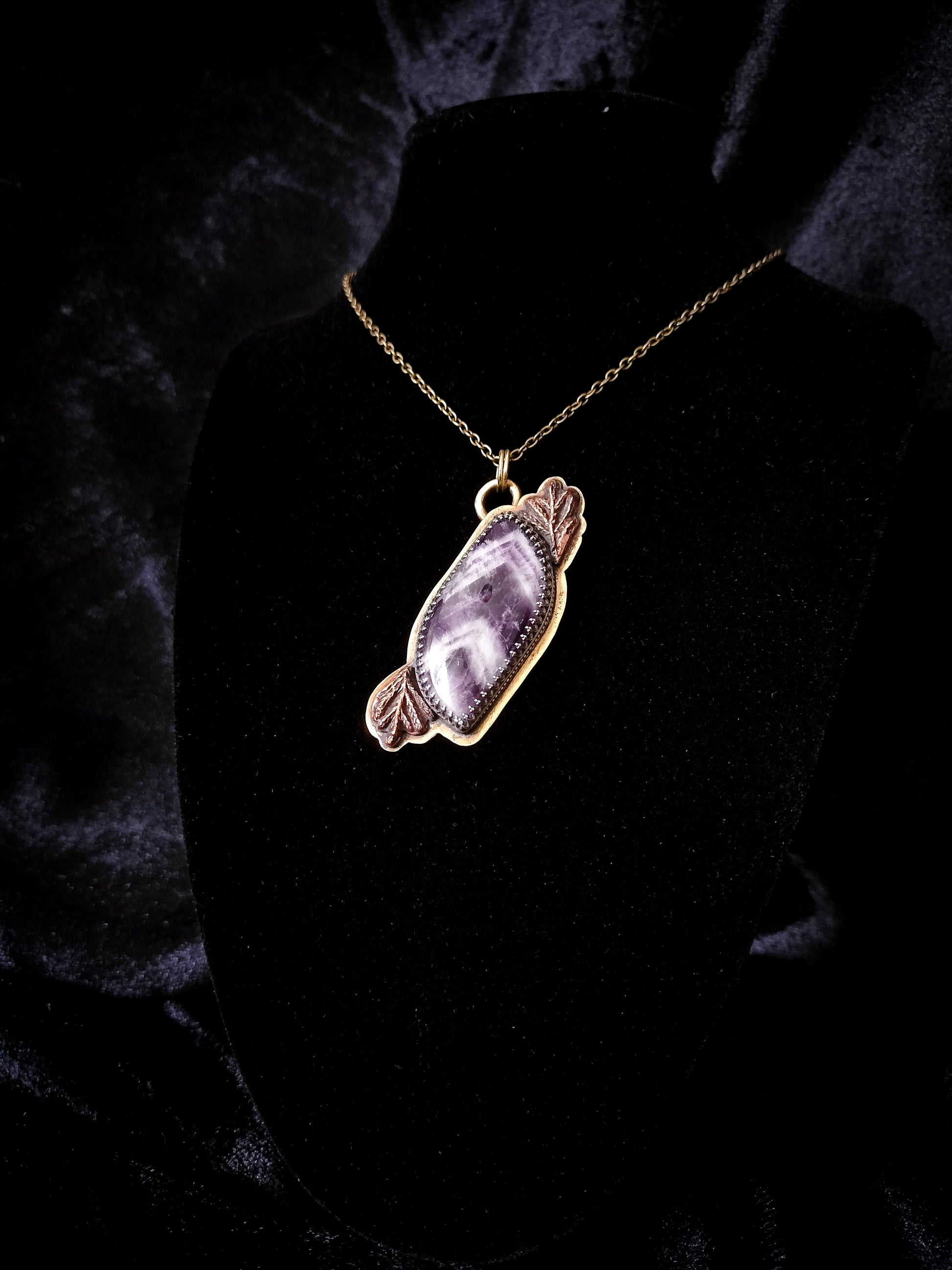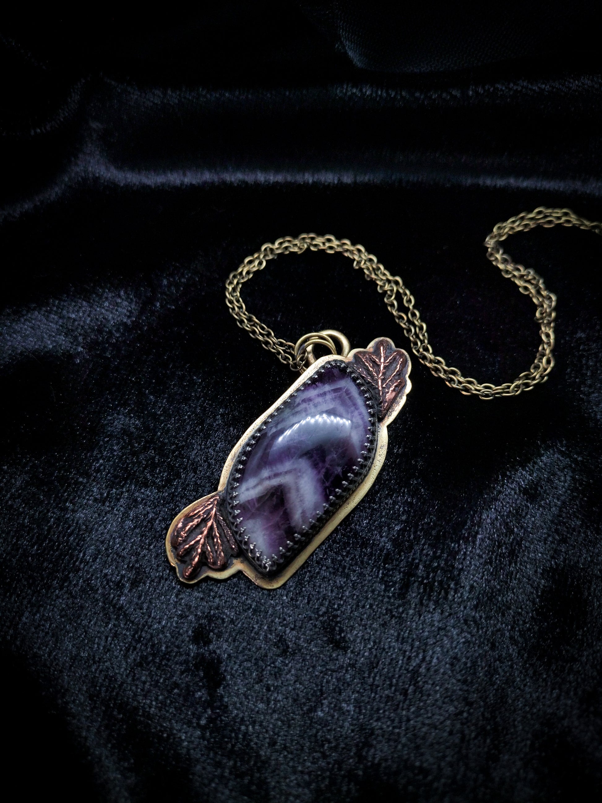 This statement piece features a deep, mysterious amethyst, a perfect jewel for any enchanting, nature-inspired look. Embellished with copper elven-inspired designs, this amethyst pendant is a perfect fit for the current cottagecore trend and will add an air of sophistication to any wardrobe.